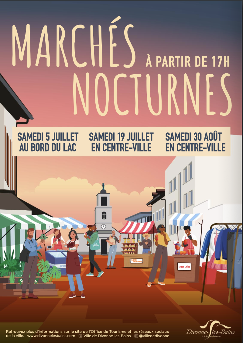 📅 Vendredi 19 juillet et vendredi 30 août, de 17h à 22h, le centre-ville de Divonne-les-Bains s’anime pour deux marchés nocturnes pleins de charme !